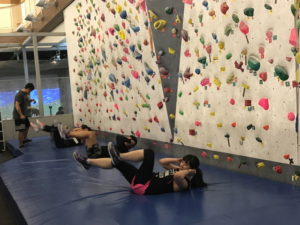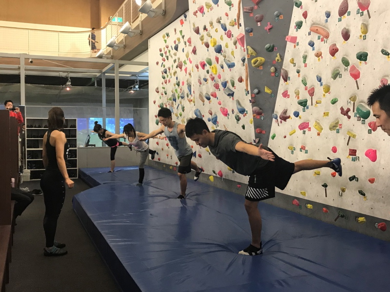 はじめにボルダリングウォールを登り、体を温めた後、肩回りや股関節の柔軟性、体幹や腕の筋力の向上を目的としたヨガのポーズを行うそうです。